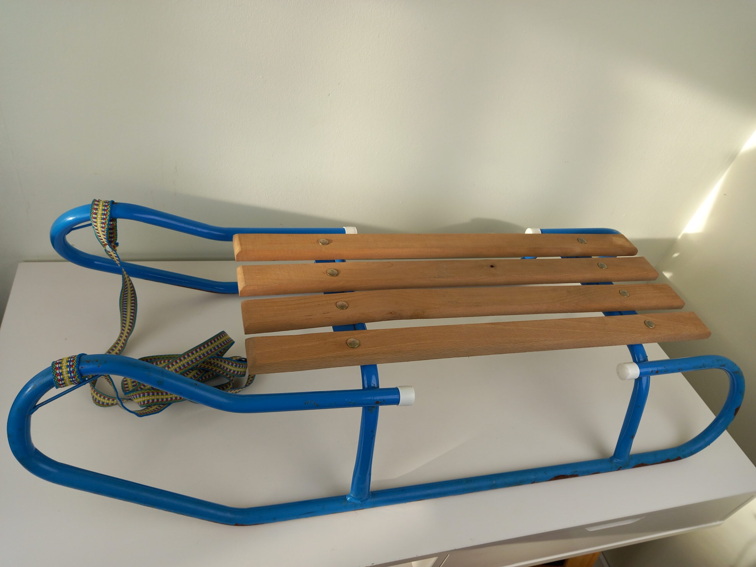 Read MoreSolidne metalowe sanki w kolorze niebieskim z drewnianym siedziskiem. Stan: dobry, używany (jak na zdjęciach poniżej)